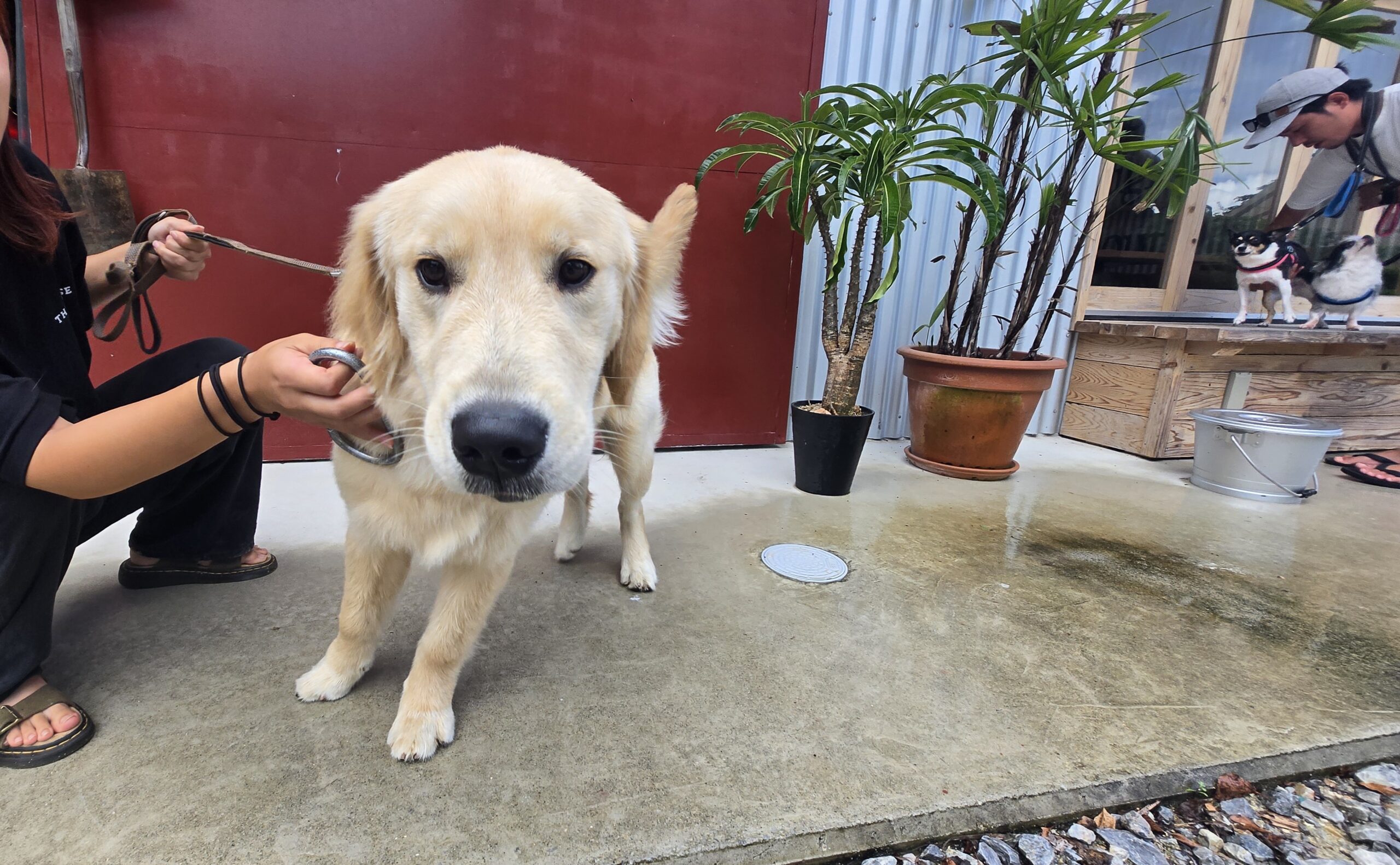 お店の看板犬はラブラドールレトリバーで、名前忘れました・・・。とても人懐こくてかわいいのですが、うちの子たちが吠えまくって大変ご迷惑をおかけしました。