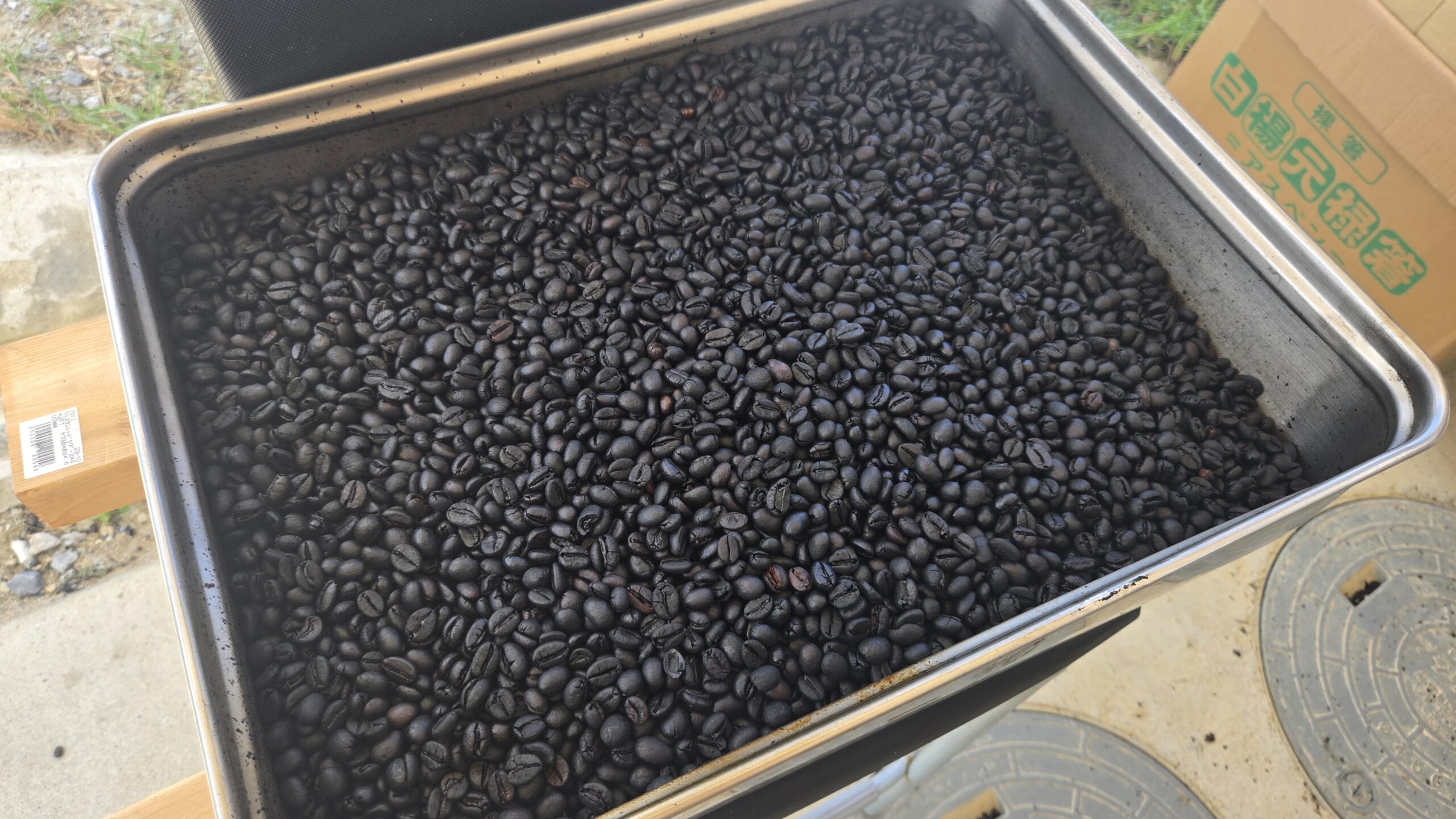 お店の裏に焙煎したてのコーヒー豆が!かなり真っ黒!